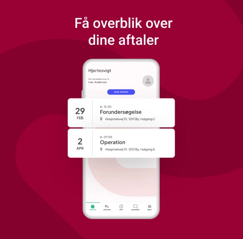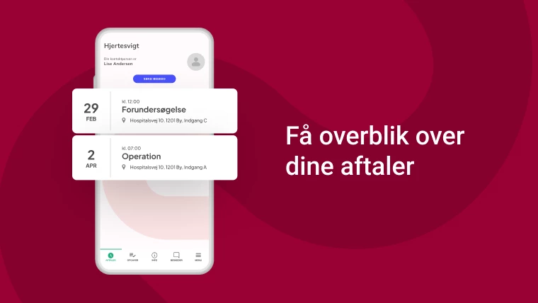 Med aftalefunktionen kan du se alle dine planlagte aftaler ét sted og få påmindelse forud for din aftale. Du kan også se hvor og hvornår du skal møde.