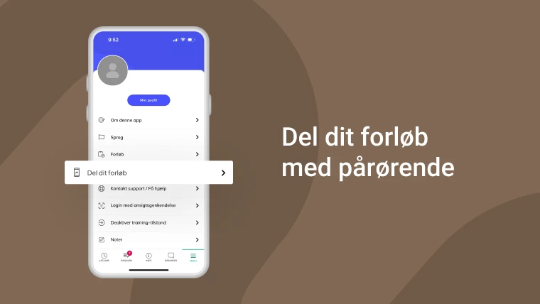 Det er muligt at dele dit forløb med pårørende, så de får indsigt i dine aftaler og information i dit forløb og dermed bedre kan støtte dig undervejs. Det er frivilligt hvem man deler sit forløb med og du kan til en hver tid stoppe delingen.